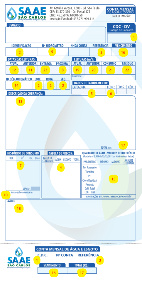 1 Código de Cadastro: Número de identificação do imóvel que agiliza o acesso do Saae via computador às informações sobre o usuário, como o nome, endereço completo, categoria da ligação, últimos consumos e possíveis débitos.