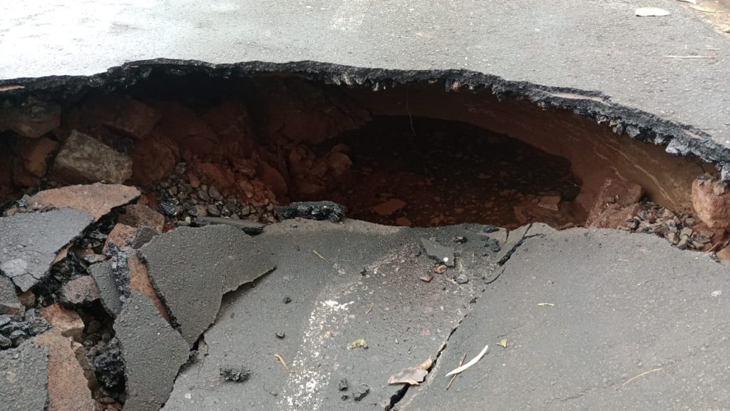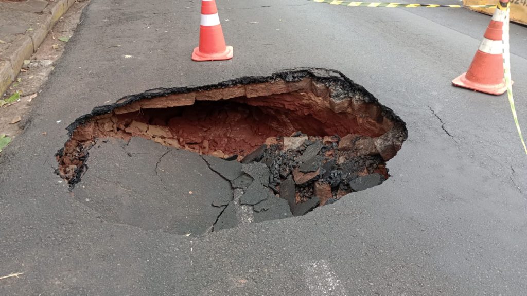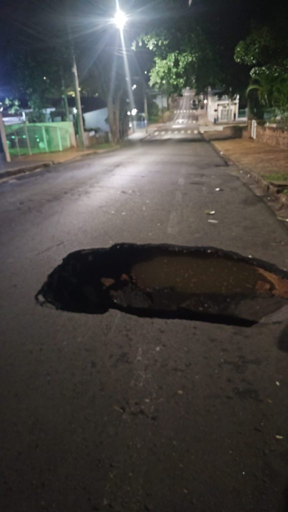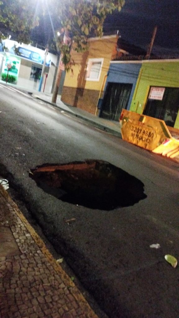 Uma grande cratera se abriu na noite de ontem, quarta-feira, dia 05/11, e com apoio de Agentes de Trânsito a via já foi sinalizada.
