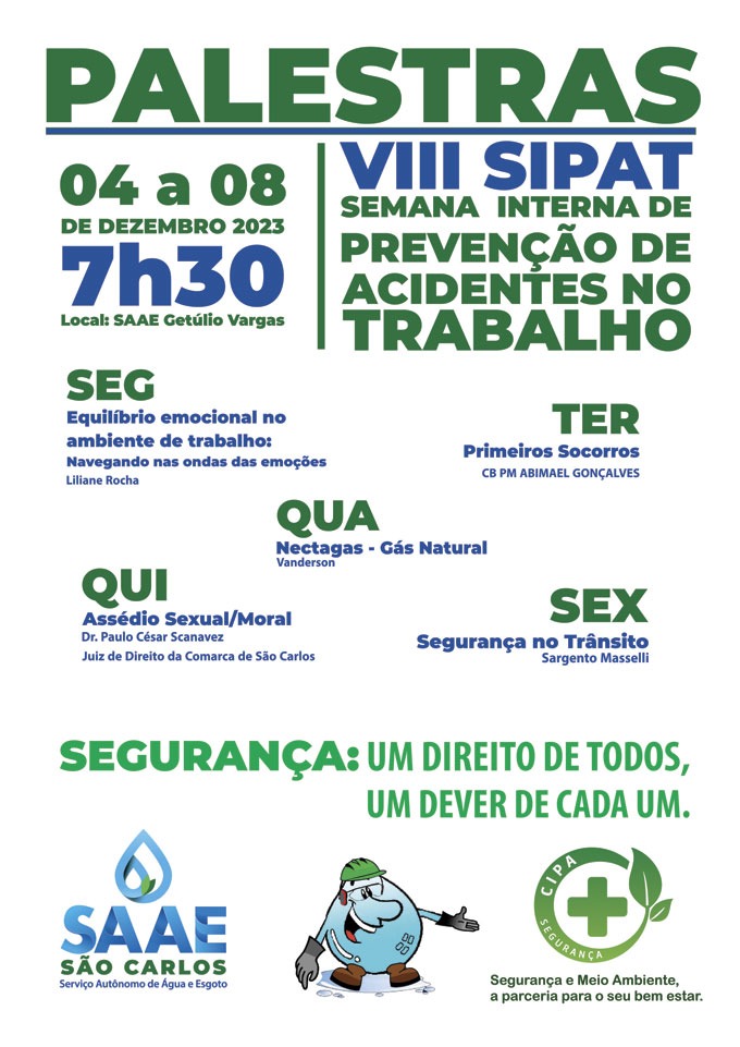 A CIPA – Comissão Interna de Prevenção de Acidentes do Serviço Autônomo de Água e Esgoto de São Carlos (SAAE), abriu nesta segunda-feira, 04/12, um ciclo de palestras dentro da VIII SIPAT, Semana Interna de Prevenção de Acidentes no Trabalho, que se estende até a próxima sexta-feira, 08/12.