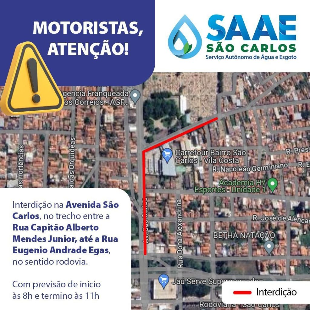 Informamos que, no próximo domingo (23/06), haverá uma interdição na Avenida São Carlos.