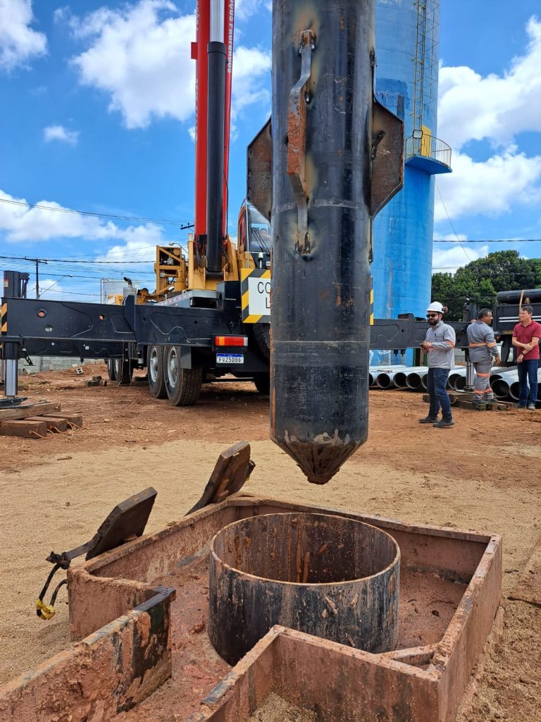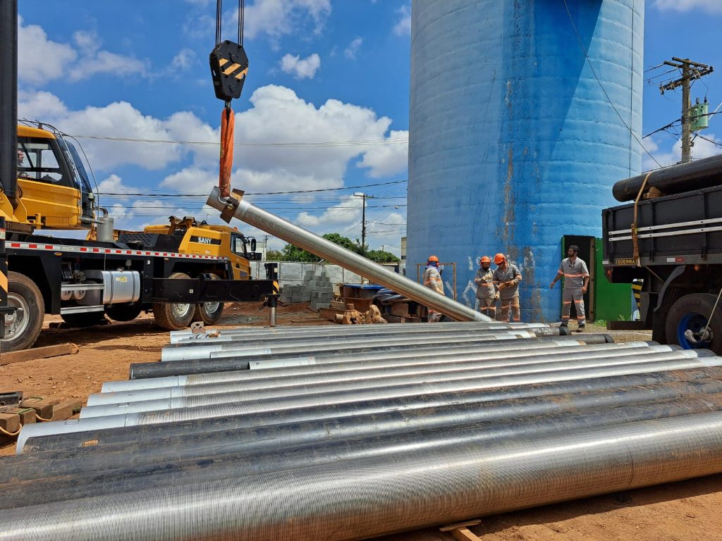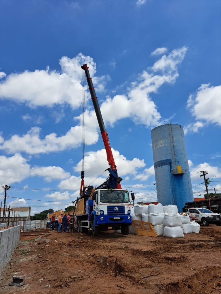 POÇO PROFUNDO E RESERVATÓRIO ELEVADO – O trabalho inicial de perfuração e, agora, o de colocação dos tubos, fazem parte da construção geral do Centro de Produção, Reservação e Distribuição de Água Potável na área própria da autarquia localizada no Cedrinho (Distrito Industrial), que tem 1.713 m2. Neste espaço, está sendo construído o poço tubular profundo, de 326 m, com capacidade de vazão de 200 m3/h, bem como um Reservatório Metálico Apoiado com capacidade para 2.650 m3 de água, ou 2 milhões e 650 mil litros.