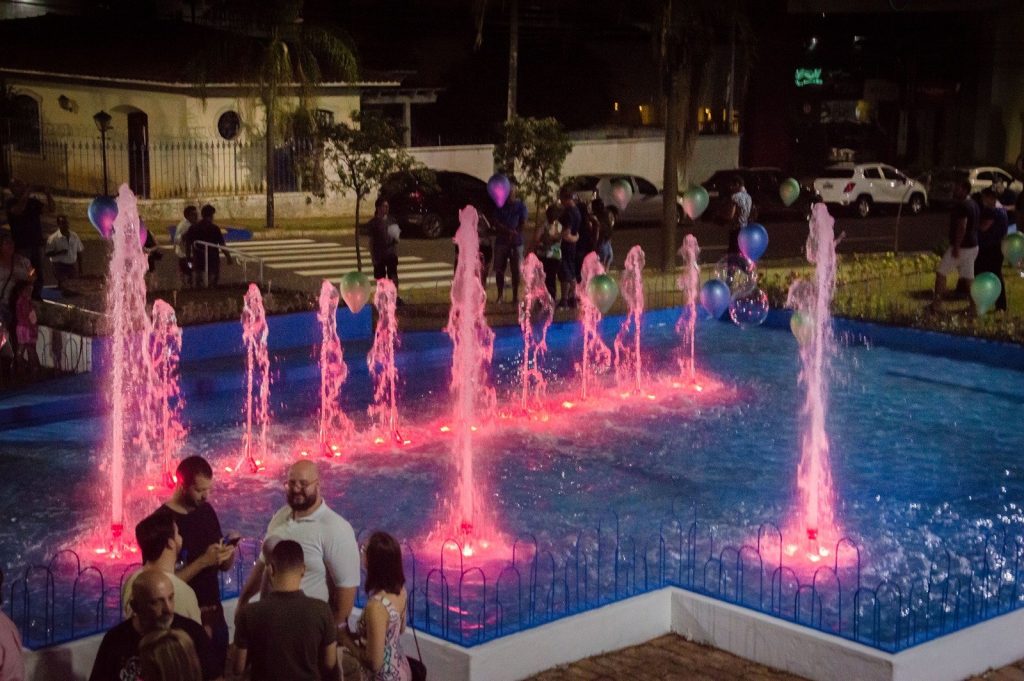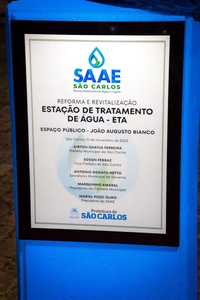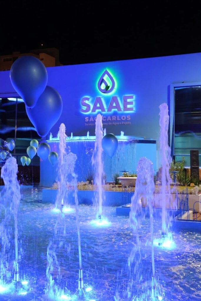 O Serviço Autônomo de Água e Esgoto de São Carlos (SAAE) devolveu à população na noite do último sábado, 11/11, um antigo ex-cartão postal no coração de São Carlos: o espaço público ‘João Augusto Bianco’ na entrada da Estação de Tratamento de Água – ETA Vila Pureza, na Avenida Dr. Carlos Botelho, 1.201. A revitalização foi o resgate de um ambiente e de um cenário que encantaram gerações. Durante a cerimônia, o show de luzes e cores, aliado ao projeto paisagístico ao redor do espelho d’água e cascata, deu o tom da nostalgia de um local que estava esquecido há vinte anos. A nova logomarca da autarquia na fachada também ganhou iluminação especial.