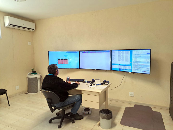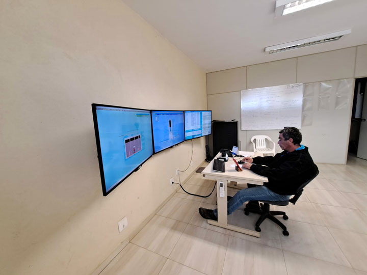 SERVIÇO 24 H – Toda a comunicação é monitorada por rádio, fibra óptica e GPRS (sinal de celular) através da antena instalada na sede do SAAE, na Avenida Getúlio Vargas. Na sala dos painéis de telemetria, ficam apenas dois servidores: 1 operador e 1 controlador. A atividade não para, funciona 24 horas e há escala e revezamento entre os funcionários. Sem esse sistema, o SAAE precisaria manter pelo menos 5 funcionários em cada unidade para operar o serviço de forma manual no local.