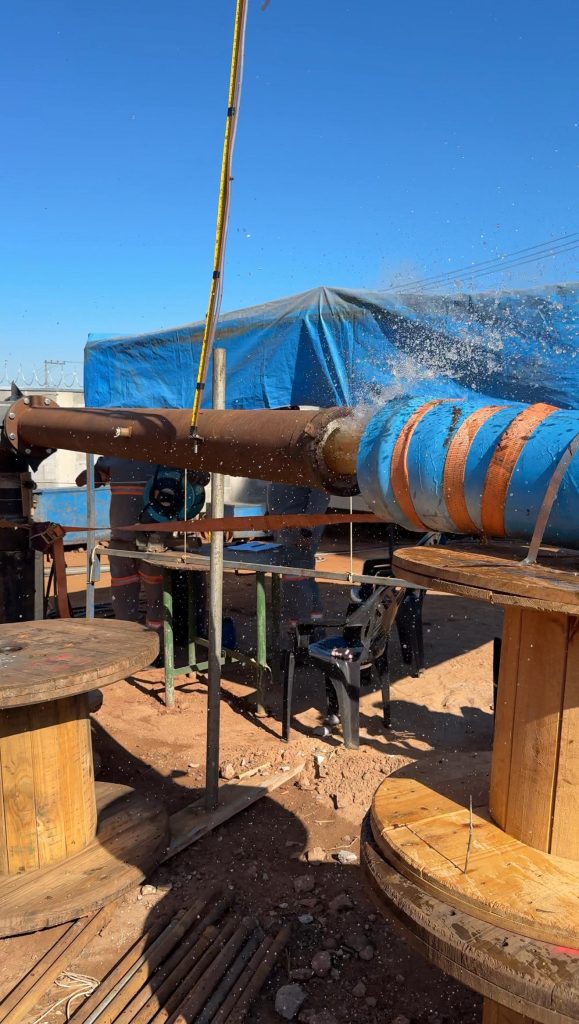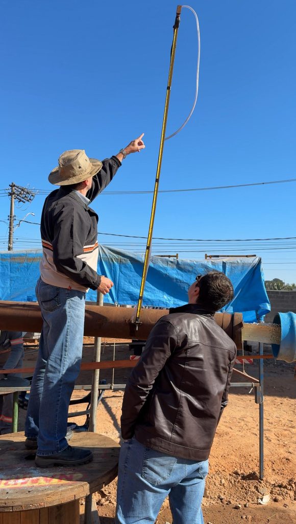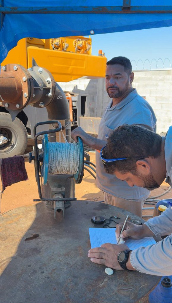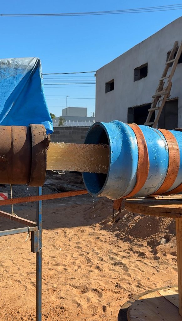 O teste, que tem duração de 24 horas, é realizado com uma bomba específica e monitorado continuamente para aferição do nível dinâmico da água. A partir desses dados, são feitos os cálculos que definirão o tipo ideal de bomba a ser instalada, garantindo a máxima eficiência do poço. Após essa fase, ainda serão realizadas mais três etapas, incluindo o último teste de vazão, que confirmará a capacidade do poço após a instalação da bomba definitiva.
