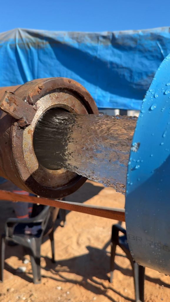 ETAPAS DA OBRA – Com 326 metros de profundidade e vazão estimada em 200 m³/h, o poço será integrado a um reservatório metálico apoiado com capacidade de 2.650 m³ de água, o equivalente a 2 milhões e 650 mil litros. Antes do teste preliminar, cinco etapas essenciais já haviam sido concluídas com êxito: perfuração do poço, introdução dos tubos de revestimento, colocação do pré-filtro (com areia de granulometria controlada), lavagem do poço e desenvolvimento da vazão.